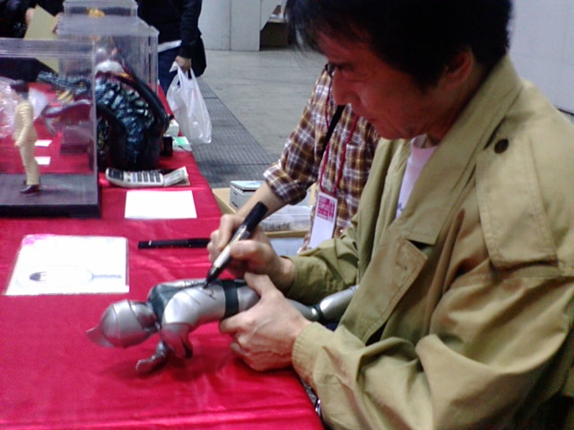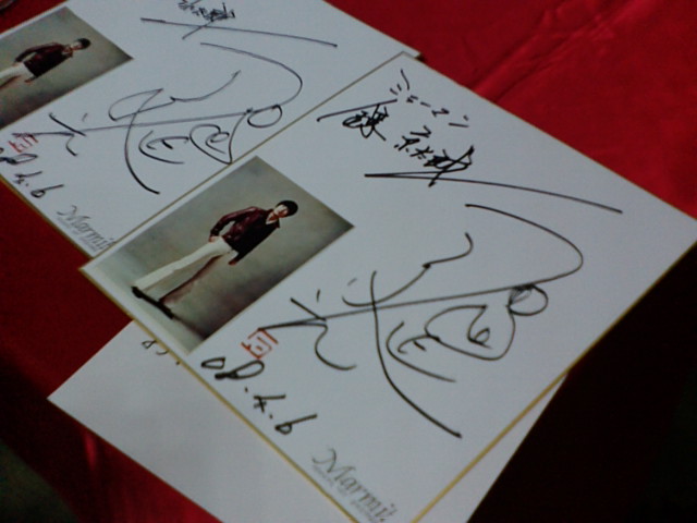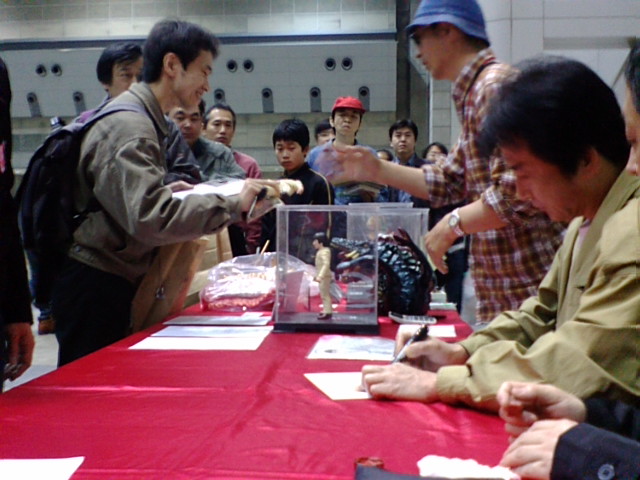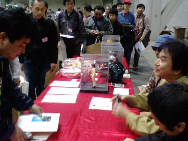 というのはオーバーを通り越して冗談ですが、見ての通り一人一人に気さくに話しかけられるセンセ。原則は、当日限定の生鏡京太郎人形を購入された人にのみなんですが、見ての通り他のグッズへのサインもこなしておられました。