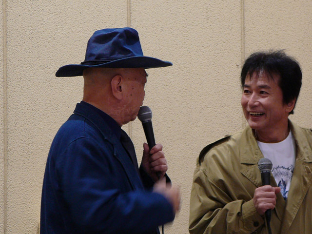 何故か「必殺」のテーマで現れた石田氏に続き、ゲストの佐々木氏も登場。撮影当時の熱い想い出話に華が咲き、最後は「仮面ライダー一文字隼人」の大見得も切ってくれました。石田氏はというと、「変身すると屋根壊しちゃうから」という、30年近く前に飛行機の中で少女に向けて言った「苦肉のギャグ」(本読んでると分かります)でさらりとかわしておられました。