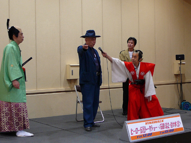 去る3月20日(春分の日)、海老名で「ヒーロー伝説トークショー」と題して、石田延之氏、ゲストの佐々木剛氏がトークショーを開かれました。当日の感想はというと「寒い」としか返事がなかったのですが、本当寒い一日でした。寒いし、雨はじゃんじゃん降るはでしたが、ばか殿と老中に扮した司会進行の掛け声で、石田氏が現われると嘘のように空が晴れ渡り…というのは夢のお話で雨は終日降り続きました。