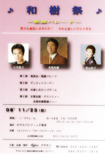 歌手の長尾和樹さんのディナーショウに、私もゲストで参加します。他に青山和子さんもご出演なされます。